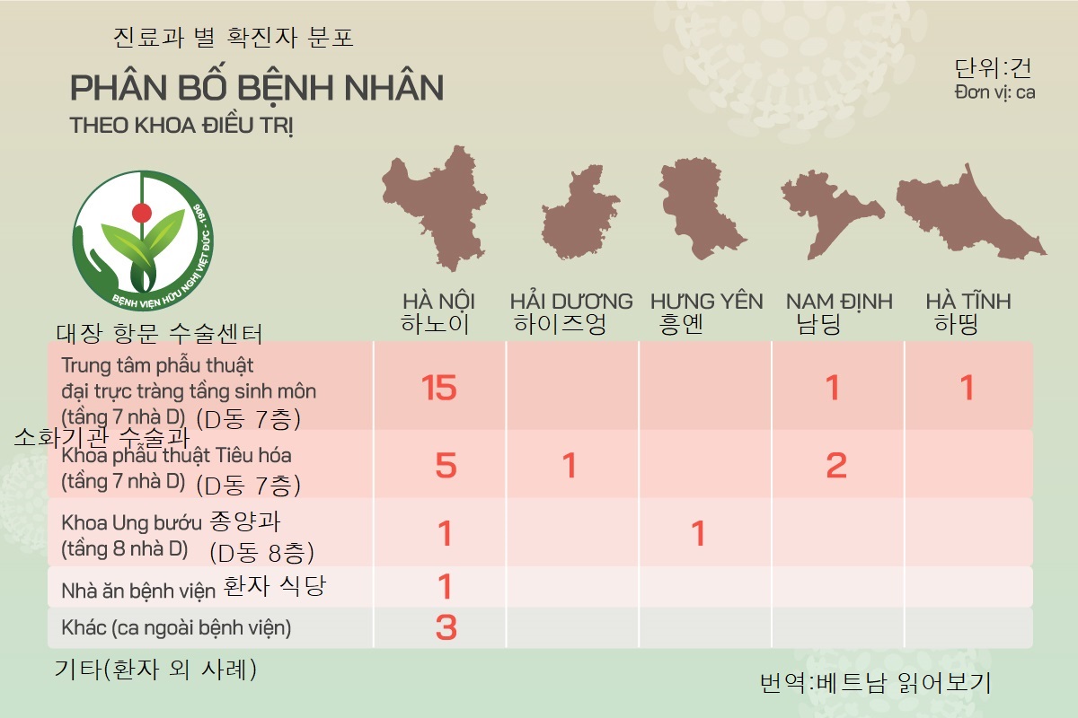 하노이 CDC 책임자에 따르면 보건 부서는 아직 감염원을 파악하지 못했으며 베독 우호병원의 발병은 많은 감염 주기를 지났을 수 있어 감염사례 수는 계속 증가할 것이라고 합니다.