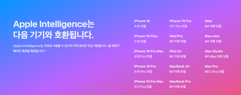 지원 목록의 기기들은 M1칩 이상을 사용하는 아이폰16, 16플러스, 16프로, 16프로맥스, 15프로, 15프로맥스, 아이패드와 맥이 포함됩니다.