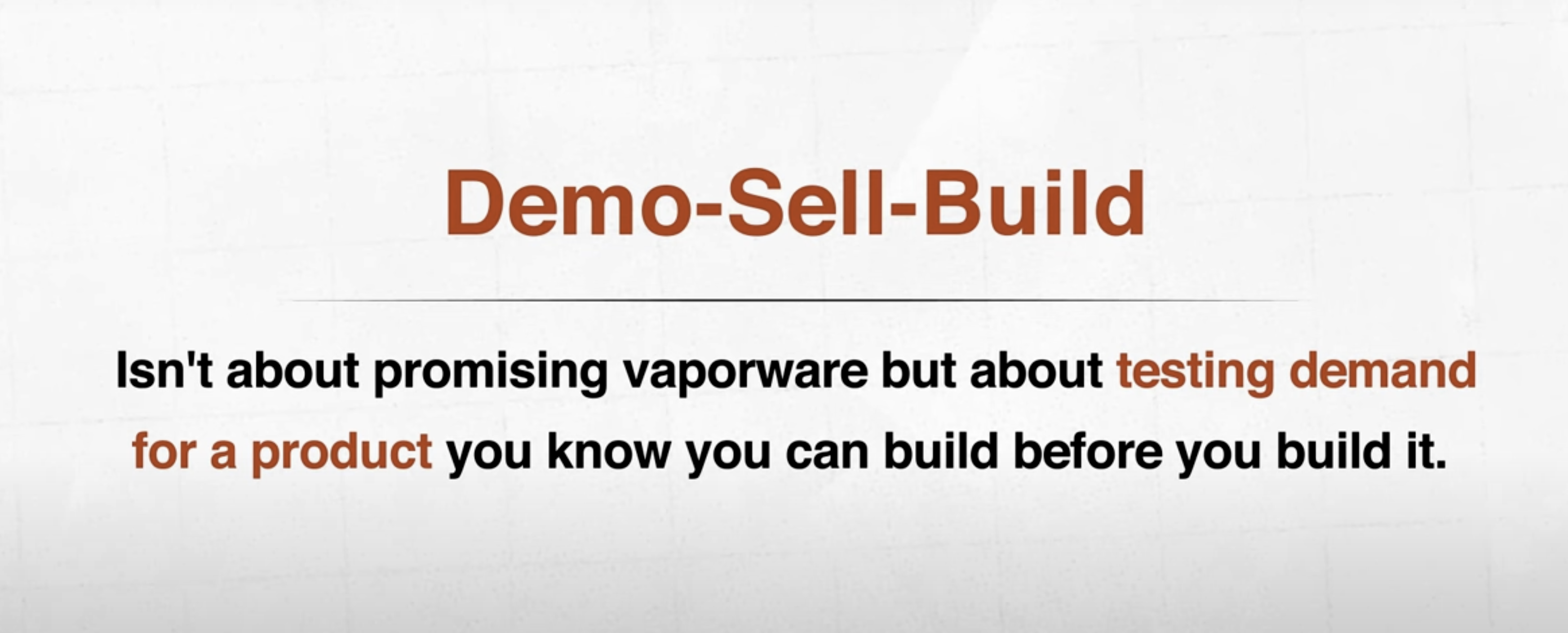 먼저, 판매를 성사시키는 것이 바로 여러분이 목표로 하는 것이며, 이는 좋은 문제라는 점을 기억하세요. 대부분의 창업자들은 고객이 언젠가 구매하기를 '희망하며' 제품을 구축하기 시작합니다. '데모-판매-구축'을 통해, 여러분은 '희망'에서 그들이 여러분이 구축할 것을 구매할 것이라는 '확신'으로 전환할 수 있습니다.