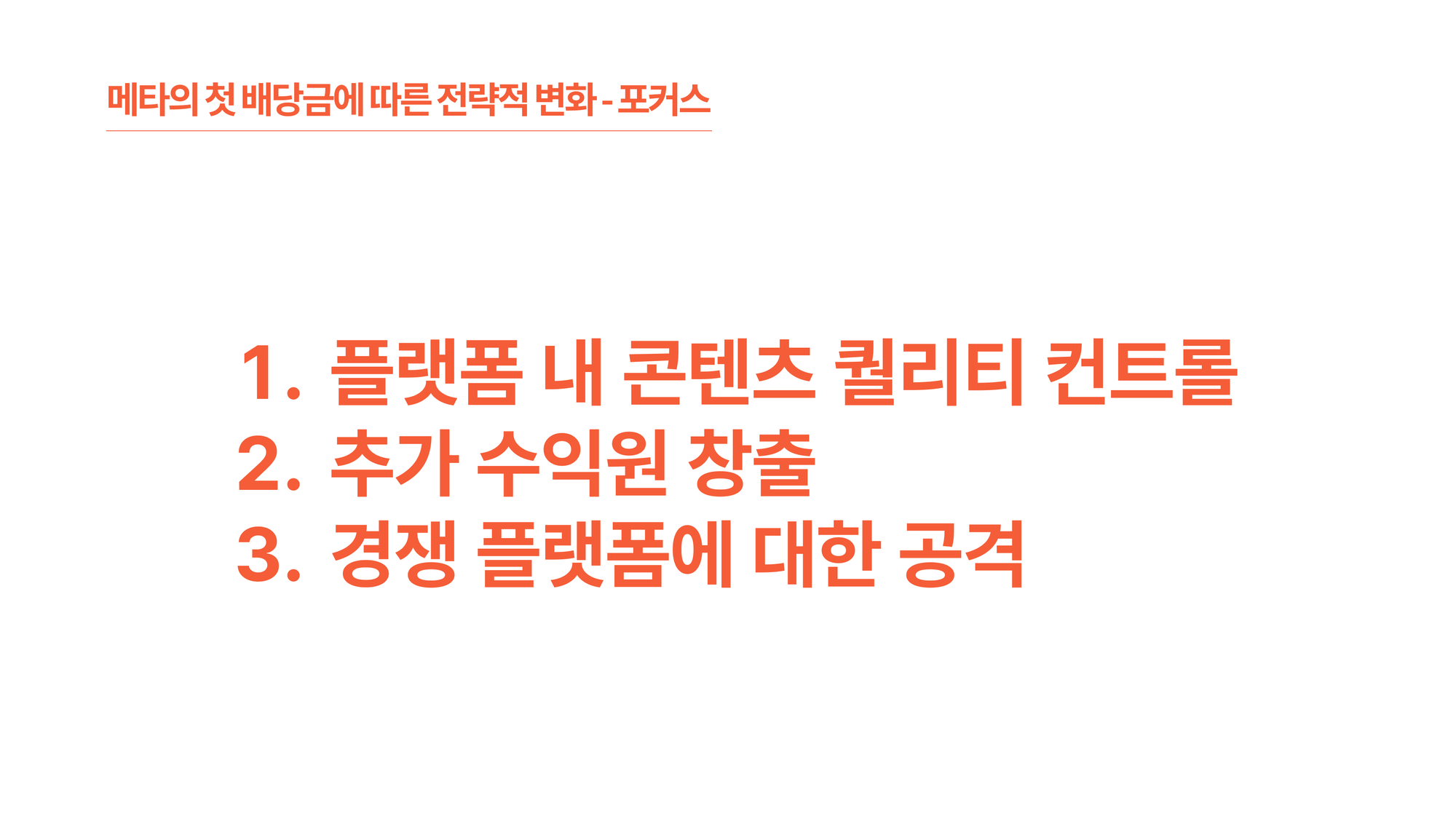 배당 자체보다 중요한 것은 이 결정이 가지고 있는 의미입니다. 메타가 상장된 지 20년 만에 이루어진 이 선택은, 회사가 성장 중심에서 수익성과 안정성 중심으로 전략을 전환했음을 보여줍니다. 이를 통해 메타는 '주주 가치를 추구한다' 는 메시지를 시장에 전달합니다.
