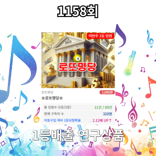 무료 연구상품을 함께 운영하고 있고 1158회 1등번호 배출한 1등되면뭐할까연구소장님이 운영하는 로또 연구 상품! ★유료★ 1등만이 살길이다 연구상품을 추천드립니다.