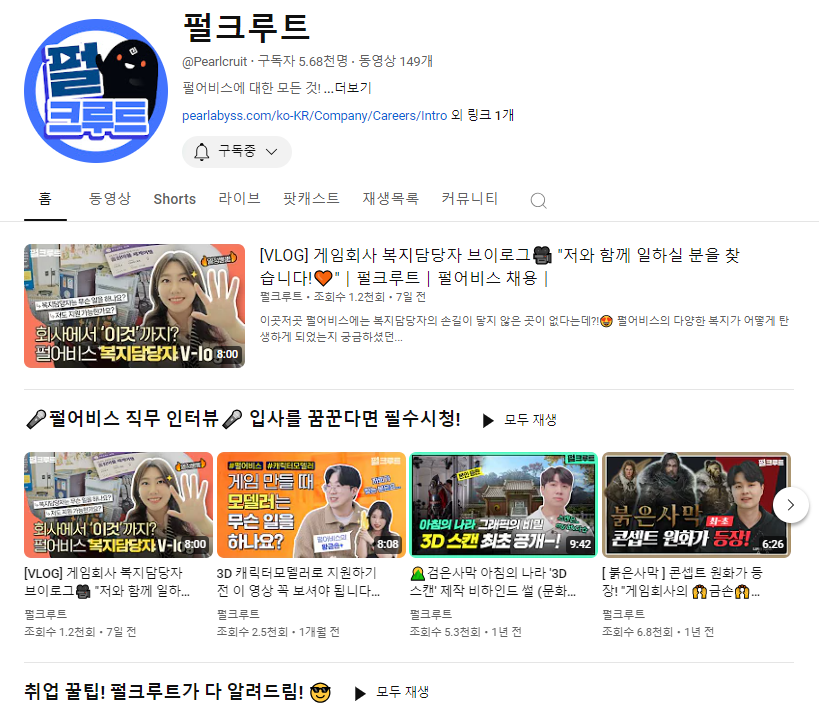 대표적인 예로, 펄어비스를 소개할게. 펄어비스는 검은 사막이라는 대표작을 가진 게임 개발사로, 채용 마케팅을 다채롭게 펼치는 기업 중 하나야. ,펄어비스는 '펄크루트'라는 자체적인 유튜브 채널을 운영하며 펄어비스 입사와 관련한 다양한 콘텐츠를 제공하고 있어. 여기서 눈에 띄는 점은, 단순한 입사 정보 전달이 아니라, 구직자들에게 좀 더 유연하게 다가갈 수 있는 소통 방법을 사용하고 있다는 거야. 직무 인터뷰, 펄어비스 사옥 탐방, 펄어비스 근처 맛집 등 재치와 정보 전달을 모두 갖추었지.