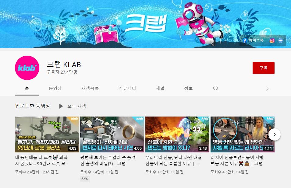 KBS도 MBC와 비슷하게 유튜브 채널 ‘크랩(KLAB)’을 운영하고 있어. 14F와 동일하게 최근 트렌드 및 이슈에 대해 전달하는 콘텐츠를 주로 올리고 있지. 이외에도 ‘채크인’이라는 콘텐츠를 따로 제작중인데, 평소 궁금하지만 물어볼 곳이 없어서 해결하지 못했던 사소한 질문에 대한 답을 찾아주는 콘텐츠야 🔍 크랩 또한 소비자들의 반응을 적극적으로 이끌어내며 점점 인기를 얻고 있어.