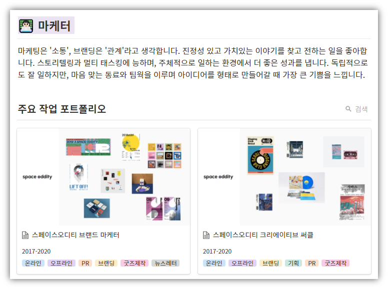 ์ฒซ ๋ฒ์งธ ์ฌ๋ก์ฒ๋ผ ์ง์ ํ์ฌ์ ์ง๋ฌด์ ๋ง์ถฐ ๋ ธ์ ํฌํธํด๋ฆฌ์ค๋ฅผ ์์ฑํ ์๋ ์์ง๋ง, ๊ทธ๋ฅ ์๋ ๊ทธ๋๋ก์ ๋๋ฅผ ๋ณด์ฌ์ฃผ๋ ๊ฒ๋ ์ข์ ๋ฐฉ๋ฒ์ธ ๊ฒ ๊ฐ์. ๋ง์ผํฐ๋ก์, ๊ทธ๋ฆฌ๊ณ ํ ๋ช ์ ์ฌ๋์ผ๋ก์ ๋ด๊ฐ ์ด๋ค ๊ฐ์น๊ด์ ๊ฐ์ง๊ณ ์๋์ง๋ฅผ ๋ ธ์ ๋งํฌ ํ๋์ ์ต๋ํ ๋ด์๋ด๋ ๊ฑฐ์ง. ๋ง์ผํฐ ์ ํ์ค๋์ ๋ ธ์ ์ ํ ๊ธ, ํ์ดํผ๋งํฌ, ํ์ด์ง๋ฅผ ์ฌ์ฉํด์ ๋ฐฉ๋ํ ์ด๋ ฅ์ ์ ๋ฆฌํ์ จ์ด.