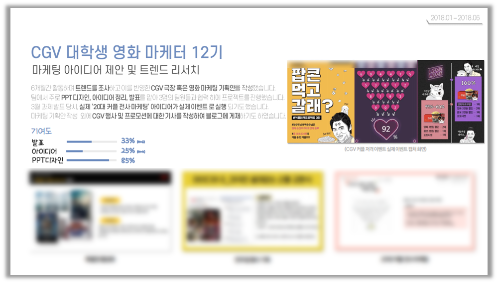 ์ฐ์ ์ ์ผ๋ก ํ๋(ํ๋ก์ ํธ) ๋ช / ๊ธฐ๊ฐ / ๋์ ์ญํ / ๋ด์ฉ / ์ฑ๊ณผ ๋ฐ ๊ฒฐ๊ณผ๊ฐ ์ฃผ๋ด์ฉ์ผ๋ก ๋ค์ด๊ฐ์ผ ํด!