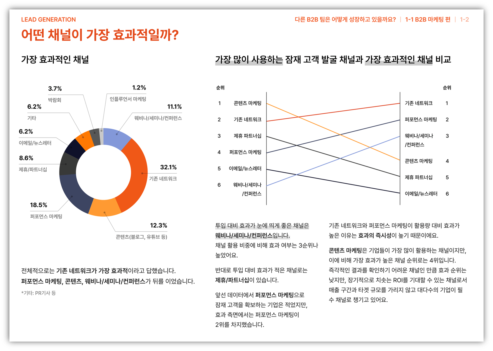 ์์ ์ธ๊ธํ re:catch ๋ฆฌํฌํธ ์ ์ฒด ์๋ต์ ์ค B2B ๋ง์ผํ ์ฑ๋์์ 32.1%๊ฐ ๊ธฐ์กด ๋คํธ์ํฌ๋ฅผ ๊ฐ์ฅ ํจ๊ณผ์ ์ธ ์ฑ๋์ด๋ผ๊ณ ์๋ตํ์ด. ๋์์ ์ด๋ค ๋ค๋ฅธ ์ฑ๋์ ์ฌ์ฉํ๋์ง๋ ์์๋ณผ ์ ์๋๋ฐ ํผํฌ๋จผ์ค ๋ง์ผํ (18.5%), ์ฝํ ์ธ (๋ธ๋ก๊ทธ, ์ ํ๋ธ), ์จ๋น๋/์ธ๋ฏธ๋/์ปจํผ๋ฐ์ค(11.1%) ๋ฑ์ด ๋ํ์ ์ด์ง.