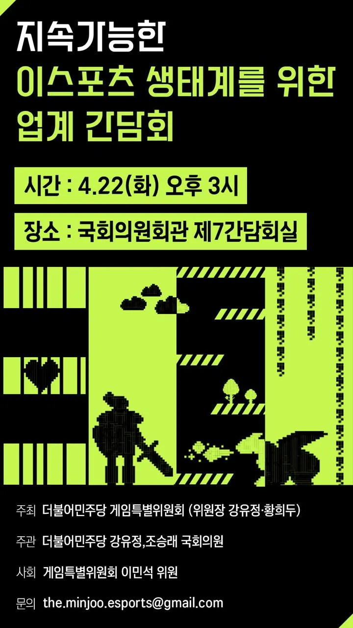 제가 속한 A분과는 종주국을 자처하는 우리나라 e스포츠 산업이 처한 어려운 현실을 정확히 파악하고, 지속가능한 산업 생태계를 조성하는 것을 목표로 하고 있습니다. 이를 위해 지난 4월 22일 국회에서는 지속가능한 e스포츠 생태계를 위한 업계 간담회가 진행되었는데요. 이번 뉴스레터에서는 간담회에서 어떤 이야기들이 나왔는지를 소개하면서, 왜 e스포츠 진흥 정책이 필요한지, 실효성 있는 진흥 정책을 위해서는 무엇을 고민해야 하는지에 대해서도 설명하고자 합니다.