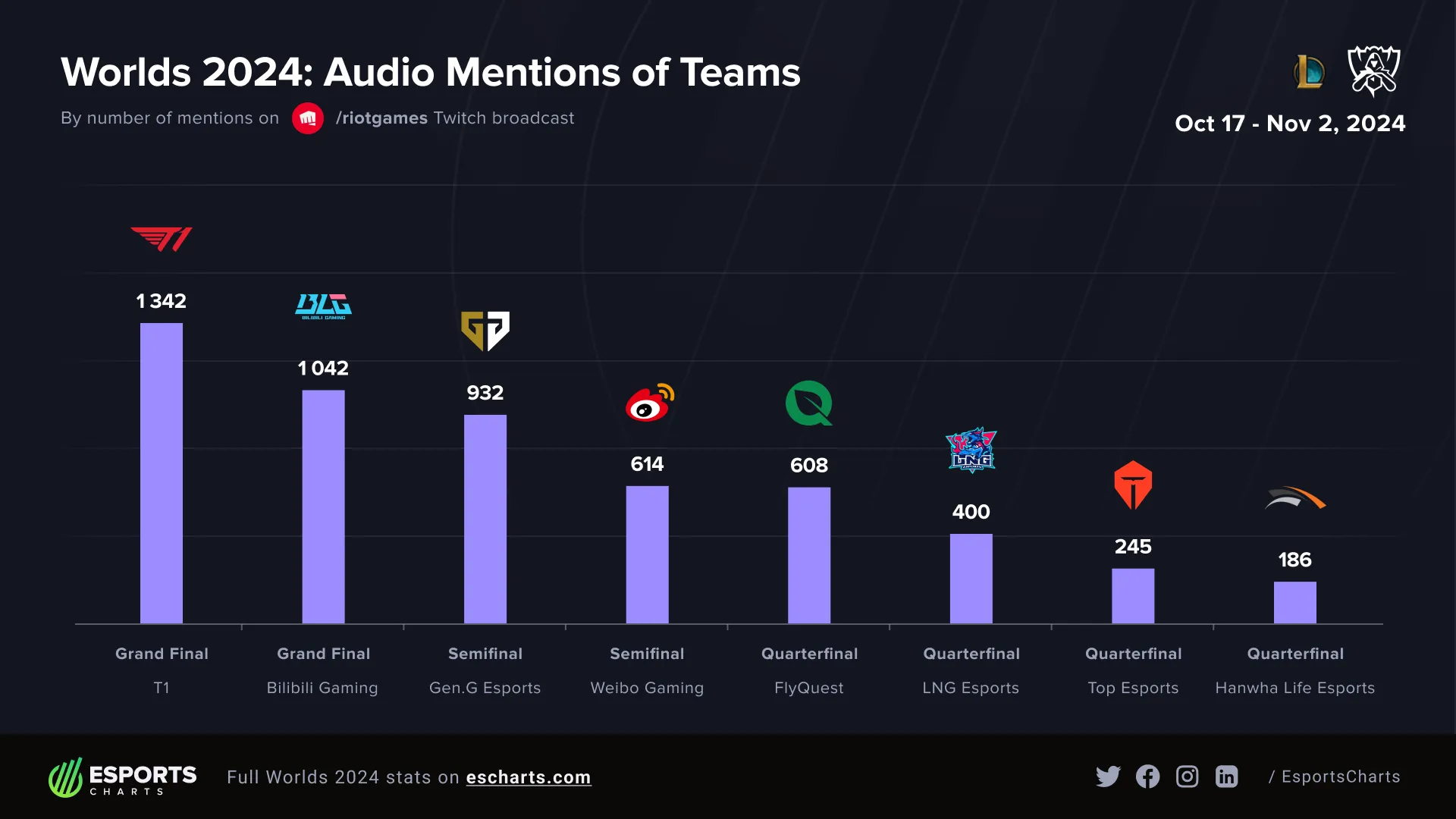 가장 많이 언급된 팀은 역시나 T1이었습니다. 이번 롤드컵의 우승 팀이었으니 당연한 결과겠죠. 이스포츠 차트의 설명에 따르면 T1의 이름 중 3분의 1은 그랜드 파이널에서 언급되었다고 합니다. BLG, 젠지, 웨이보까지 4강 진출 팀들이 그 뒤를 이었습니다.