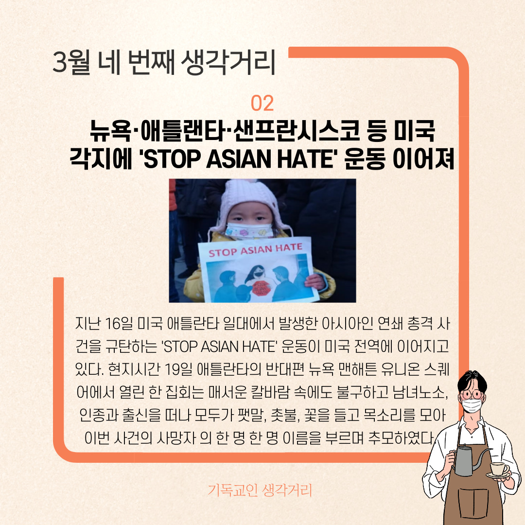 에디터 👨🏻 : 지난주 전해드렸던 '애틀랜타 총격 사건' 다들 기억하고 계시죠? 지금 미국은 1500km나 떨어진 뉴욕 맨해튼을 포함한 각지에서 이번 사건에 대해 함께 분노하고 나아가 사망자들을 함께 애도하고 있습니다.🙏 다들 아시겠지만, 'STOP ASIAN HATE', 이 문장에 함축된 뜻은 단순히 아시아계 인종에 대한 차별을 멈춰달라는 뜻이 아니라 이 세상 속 남들과 조금 다르단 이유로 차별과 비하, 심지어는 멸시까지 당하는 이들의 아우성입니다. 우리 모두 함께 희생자들을 추모하며 다시는 이런 일이 일어나지 않도록 함께 주변을 돌아보고, 'STOP ASIAN HATE ❌' 운동에 동참해 주시기 바라요!