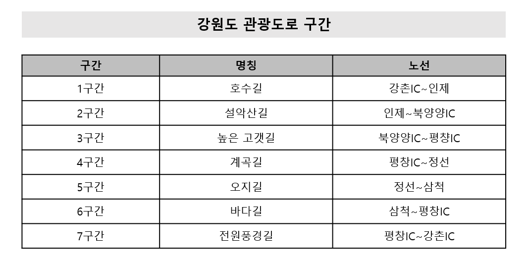 바다로 집중되는 관광수요를 내륙지역으로 분산하기 위한 강원도 관광도로 7개 노선 선정