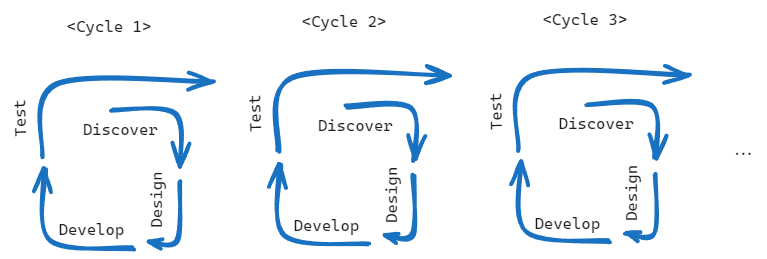 - ๊ณํ ๋ฐ ๋ถ์(Discover) - ์ค๊ณ(Design) - ๊ฐ๋ฐ(Develop) - ํ ์คํธ(Test)