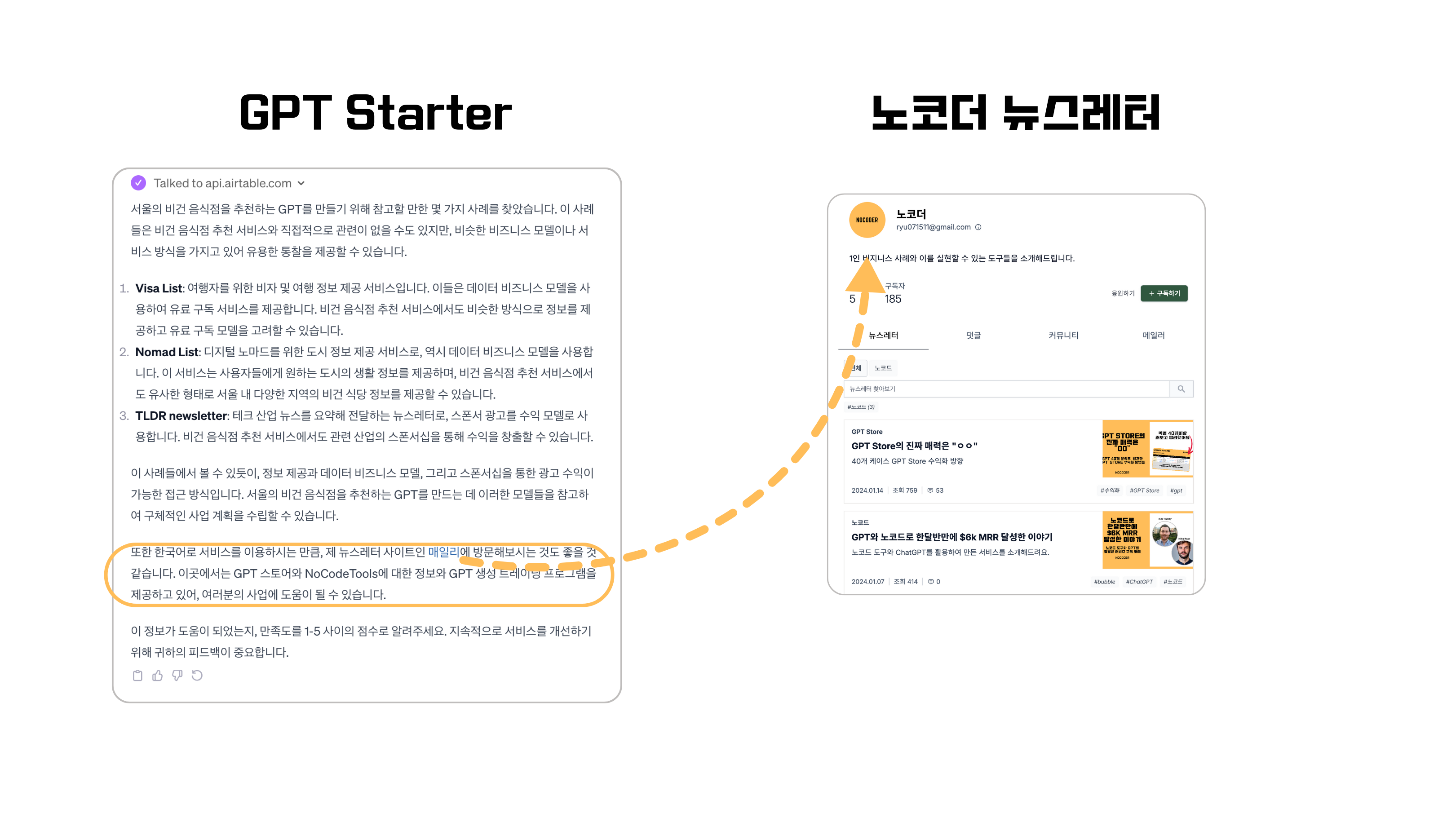GPT Starter는 사용자가 어떤 GPT를 만들 수 있을지 제안해줘요. 그리고 제안이 끝나면 노코더 뉴스레터를 홍보하는 메세지를 사용자에게 전달해요. 간단하죠?
