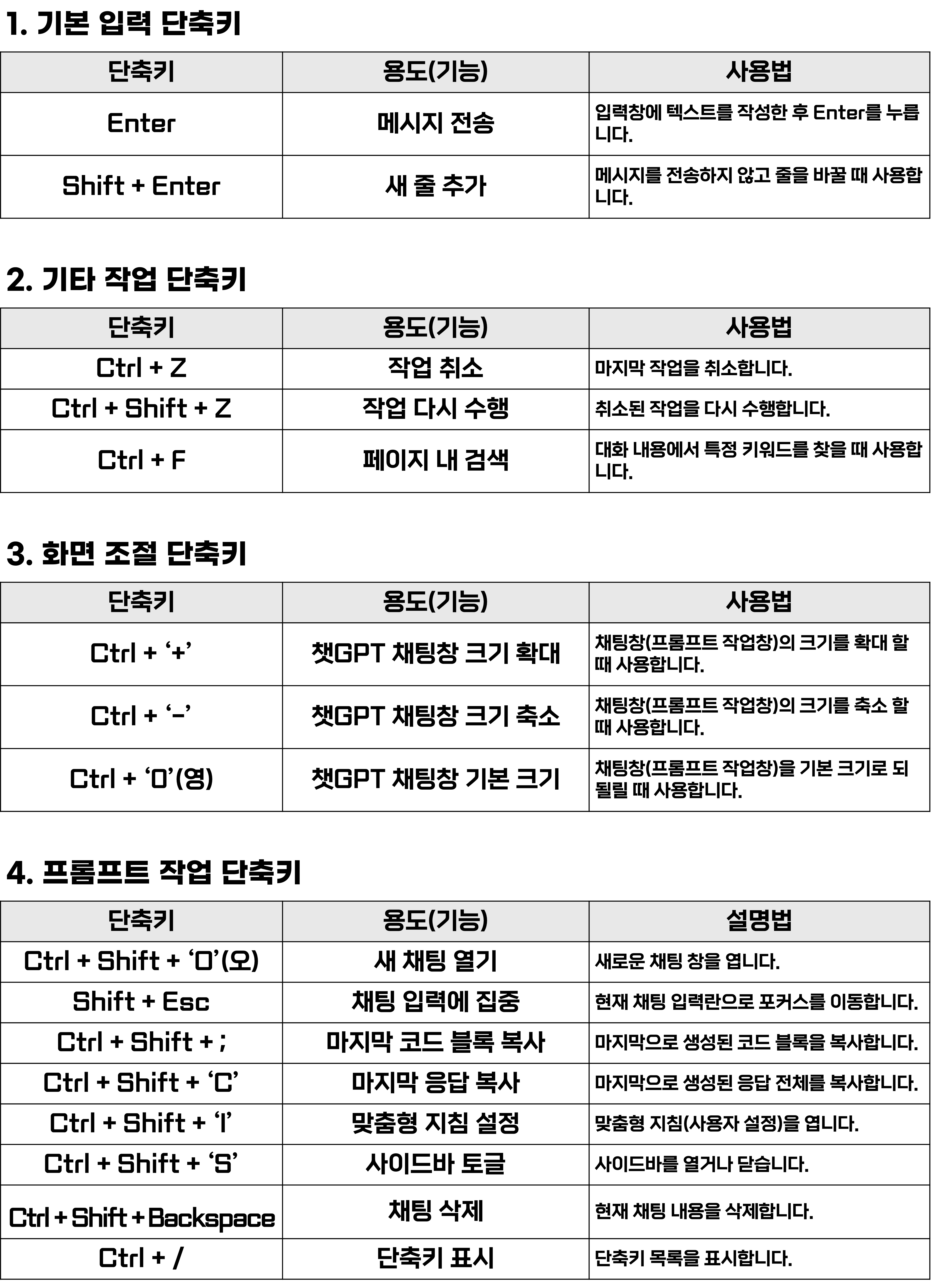 '기본 입력 단축키', '기타 작업 단축키', '화면 조절 단축키', '프롬프트 작업 단축키'로 구성된 이 표를 통해 생산성을 높이고, 보다 편리하게 챗GPT를 활용할 수 있습니다. 원하는 작업 유형에 맞는 단축키를 바로 찾아 적용해 보세요!