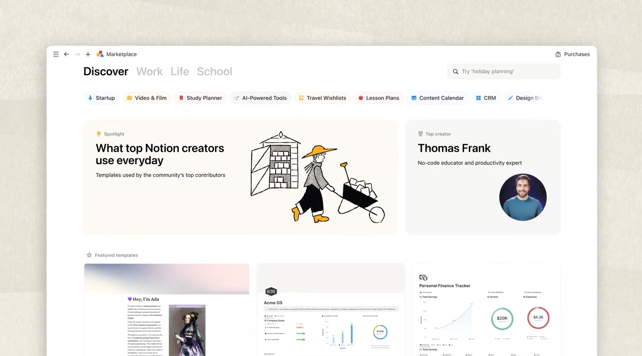 기존에는 노션 공식 템플릿 갤러리만 제공되었어요. 여기서는 템플릿 판매를 위해 외부 페이지로 연결해야 하는 불편함이 있었죠. 이제 '마켓플레이스'가 생기면, 노션에서 다이렉트로 판매할 수 있게 됩니다.