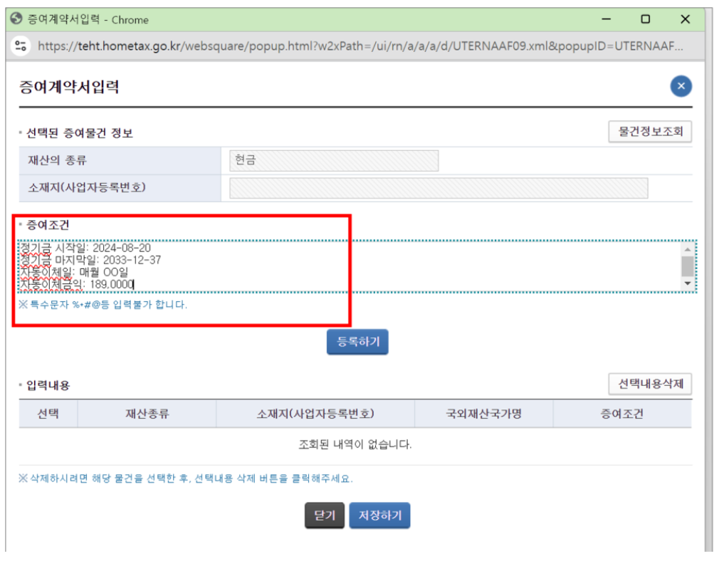 입력을 해서 등록해주시면 되구여. 입력을 한 이후 유기정기금 형식이라면, 증여계약서 입력 버튼을 눌러서 뜨는 화면에 ‘증여조건’란이 있습니다. 여기는 직접 작성해주시는 부분인데, 최대한 가급적 자세히 작성해주시는게 좋겠죠? 위 사진을 보시고 참고해서 작성해주시면 됩니다. 모든 입력이 마쳤다면, 저장하기/다음화면으로 넘어가 주시면 됩니다.
