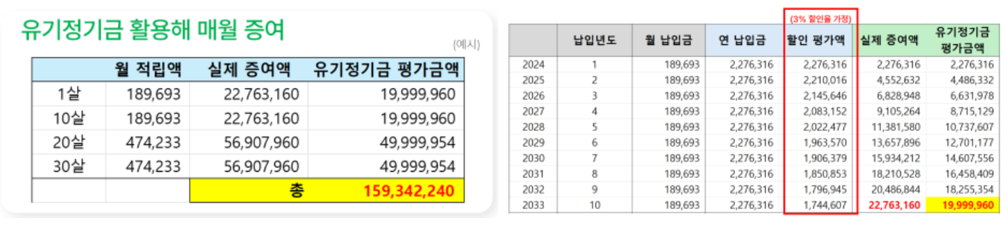 그런데 자녀 연금저축 계좌에 10년마다 몇 천만원씩 한번에 증여하려면 목돈이 필요한데 만약 상황이 여의치 않은 경우에는 어떻게 해야햘까요? 이 때에는 적립식 투자하듯 매달 돈을 나눠서 증여하는 방법도 있습니다. 그러면 증여세 공제 한도 보다도 더 많이 증여할 수도 있는 장점도 있는데요. 이걸 '유기정기금 증여'라고 합니다.