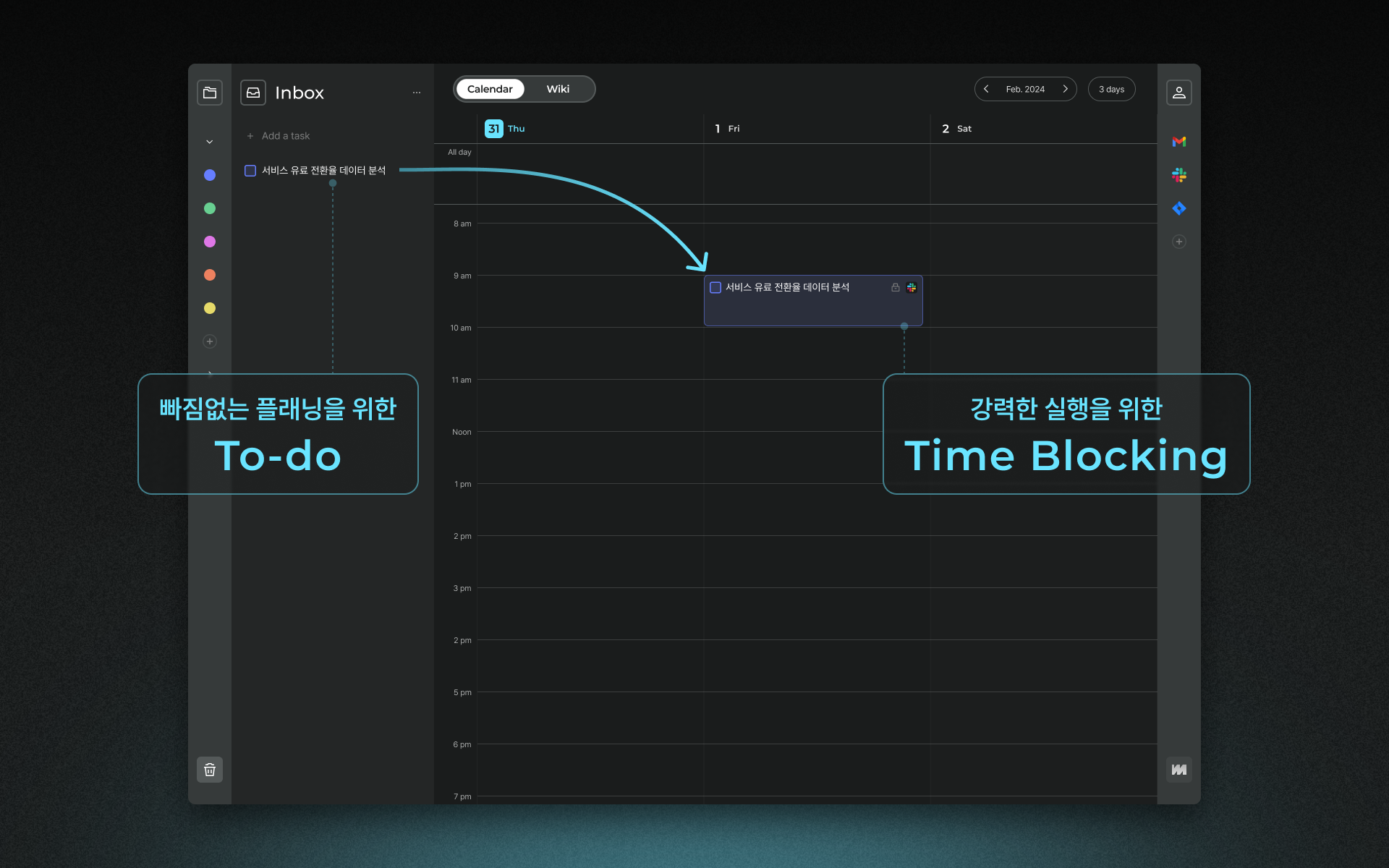 복잡해지는 업무 환경 속에서 특히 ‘일정 관리 서비스’는 ‘세컨 브레인’으로서 매우 큰 역할을 해주고 있어. 나에게 할당된 수많은 일을 정리해 주고, 덕분에 내가 몰입하고 있을 때 다른 일을 계속해서 생각하지 않고 그 일에 몰입할 수 있게 도와주기 때문이지.