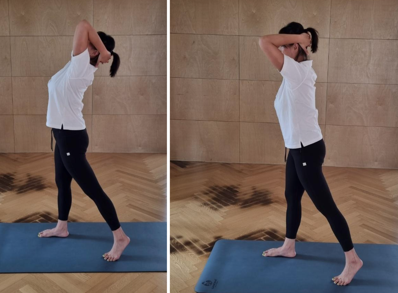 - 양 발을 앞뒤로 벌리고 서서 양 손은 뒤통수를 잡아줍니다.