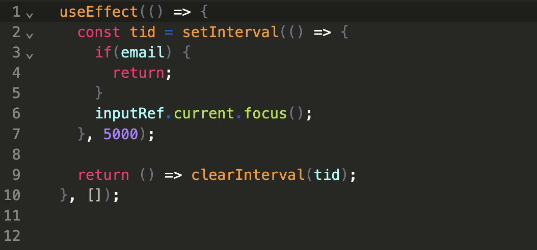 먼저 `useEffect()`가 관찰할 또는 `useEffect()`의 콜백 함수를 실행시킬 의존성은 빈 배열입니다. 이것은 아무것도 의존하지 않는다는 뜻인데, 해당 컴포넌트가 렌더링 되고나서 실행하는 용도로 씁니다. `useEffect()`로 전달한 콜백 함수는 간단한 동작을 합니다. email 상태값이 있으면 아무것도 수행하지 않고, 상태값이 없으면(falsy) 뭔가의 `focus()` 메서드를 호출합니다. 이건 `<input>` 태그에 대해 `focus()`를 호출해 포커스를 맞추는 동작으로써, 이후 편에서 `useRef()`에 대해 다룰 예정입니다. 여기에선 `<input>` 컴포넌트를 DOM 제어하듯이 다루는 게 아니라 `useRef()` 훅으로 다루게 됐다고만 이해하셔도 충분합니다. 아무튼 이러한 동작을 5초 마다 반복합니다.