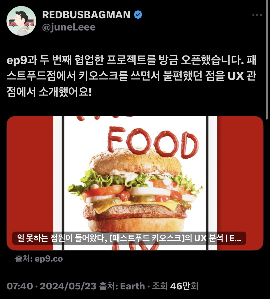 이번 콘텐츠는 트위터(X)에서 5일 만에 조회수가 46만 회를 넘어섰어요! 키오스크 사용성에 대한 불편함에 대해 충분한 공감대가 형성된 덕분이라고 생각합니다. Ep9 콘텐츠는 롱블랙과 같이 24시간마다 공유링크가 만료되는 방식이에요. 이번 콘텐츠 무료링크가 필요한 분은 제 인스타그램(@redbusbagman)으로 DM을 보내주세요!