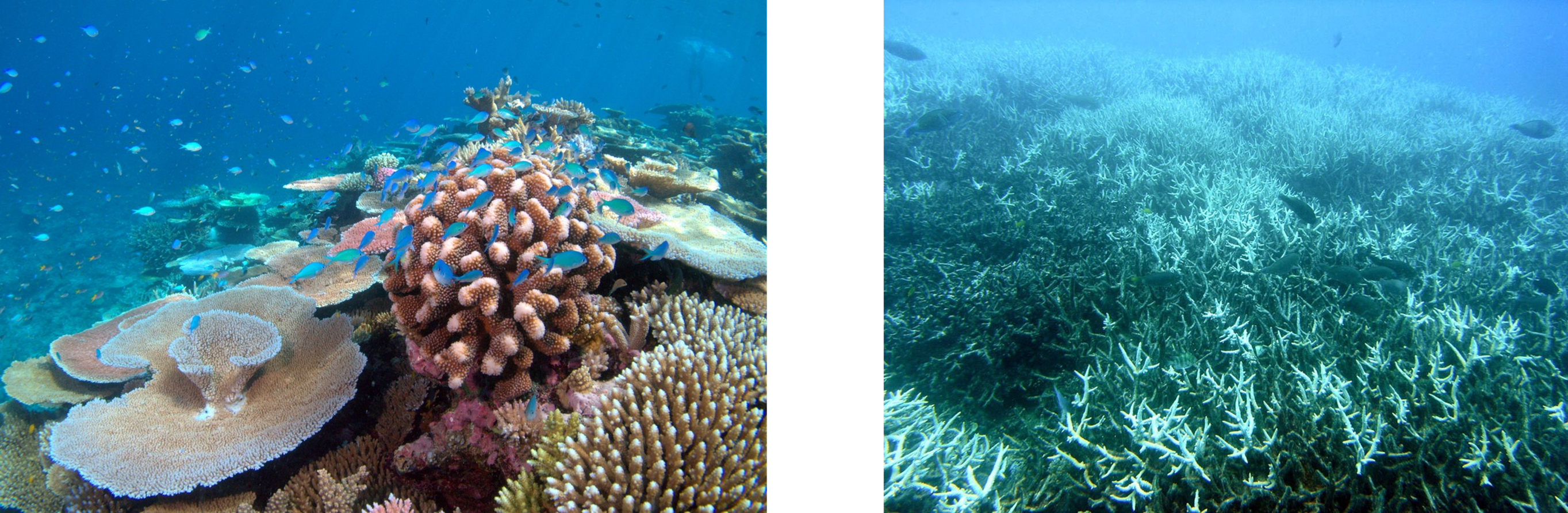 (왼쪽) 건강한 산호. 출처: Wikimedia Commons/Holobionics, File:Lodestone Reef Valentines Day 2016, Green Chromis on Coral.jpg, CC BY-SA 4.0 (오른쪽) 백화 현상이 일어난 산호. 출처: Wikimedia Commons/Acropora, File:Bleachedcoral.jpg, CC BY-SA 3.0