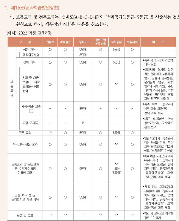 이전에는 진로선택과목에만 적용되었던 성취도별 분포 비율이 모든 보통교과로 확대된다. 또한 기존에 기재되던 표준편차 항목이 삭제되며, 평가 방식의 투명성을 높이기 위해 수행평가 비중, 영역명, 성취도별 분할점수 등이 추가로 제공된다. 이는 대학이 학생들의 성적을 정량적으로 평가하는 것뿐만 아니라, 보다 정성적으로 분석할 수 있도록 하기 위한 조치이다.