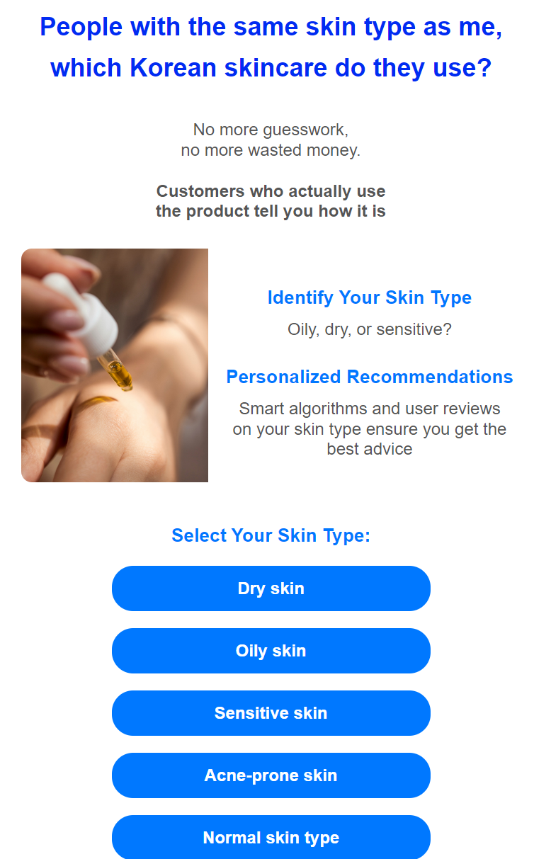 초기 솔루션 가설은 "본인의 피부타입에 맞는 제품을 추천해주면 구매할 것이다"였습니다. 상기 언급한 두려움에 비해서는 굉장히 라이트한 솔루션 가설이긴 합니다. 그래도 빠르게 니즈가 있는지 파악해보고 싶은 마음에 chatGPT를 연결해서 추천 자료를 만들고 아마존이랑 쇼피의 affiliate link로 실 구매까지 연결되는지 봤습니다.