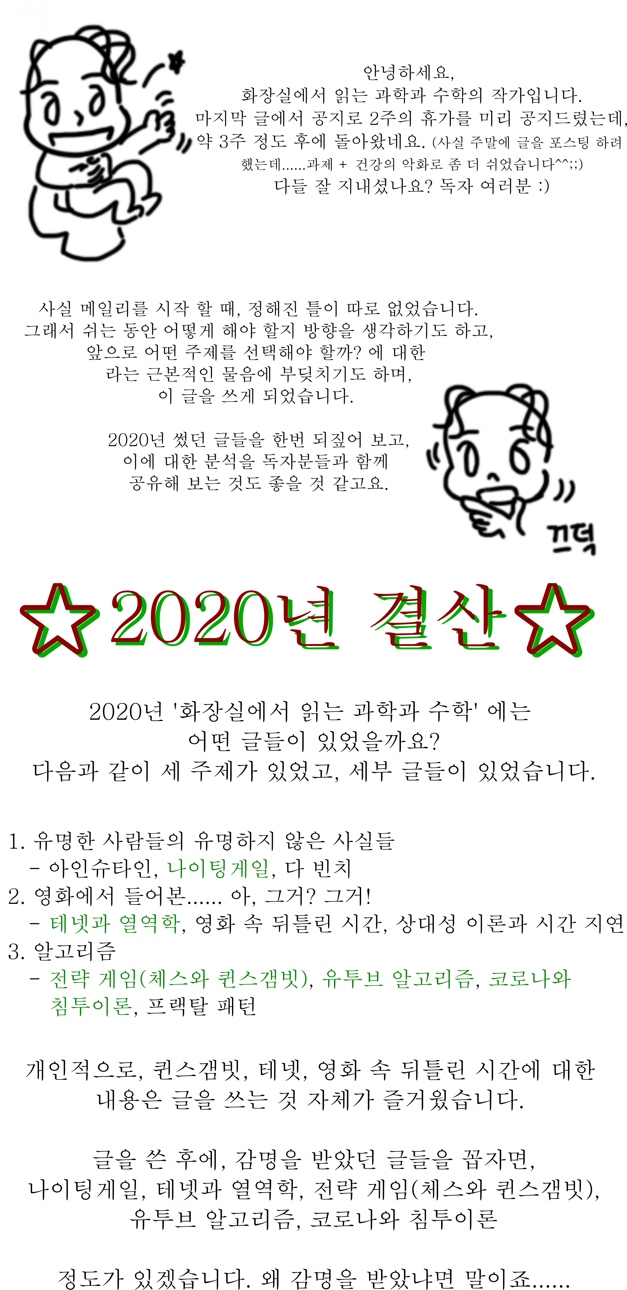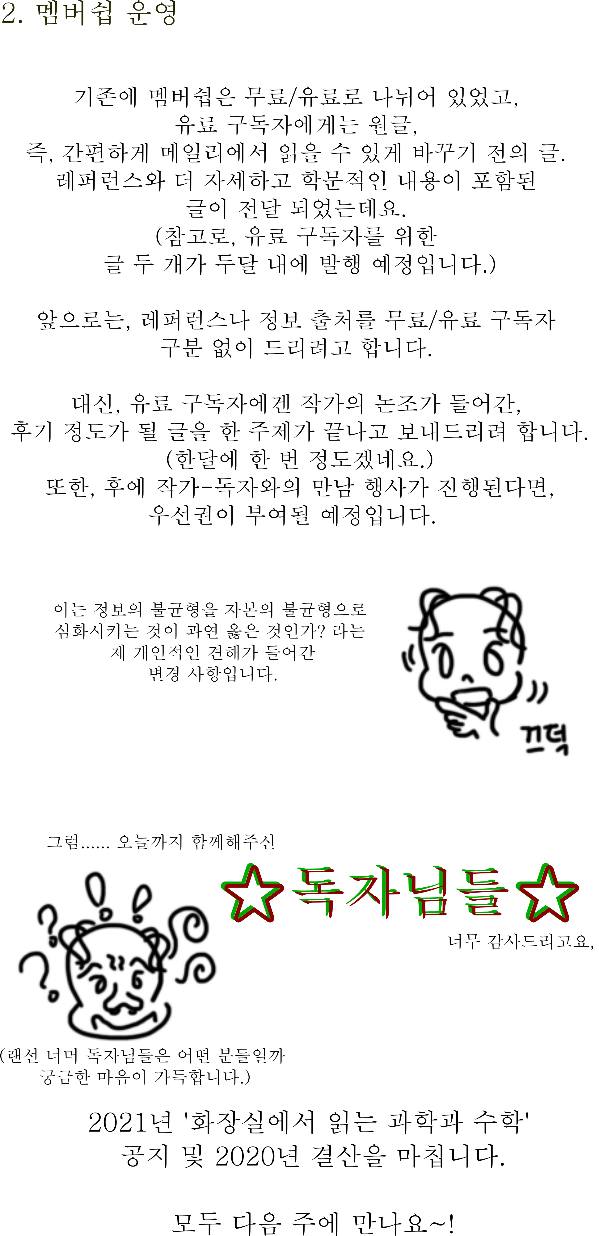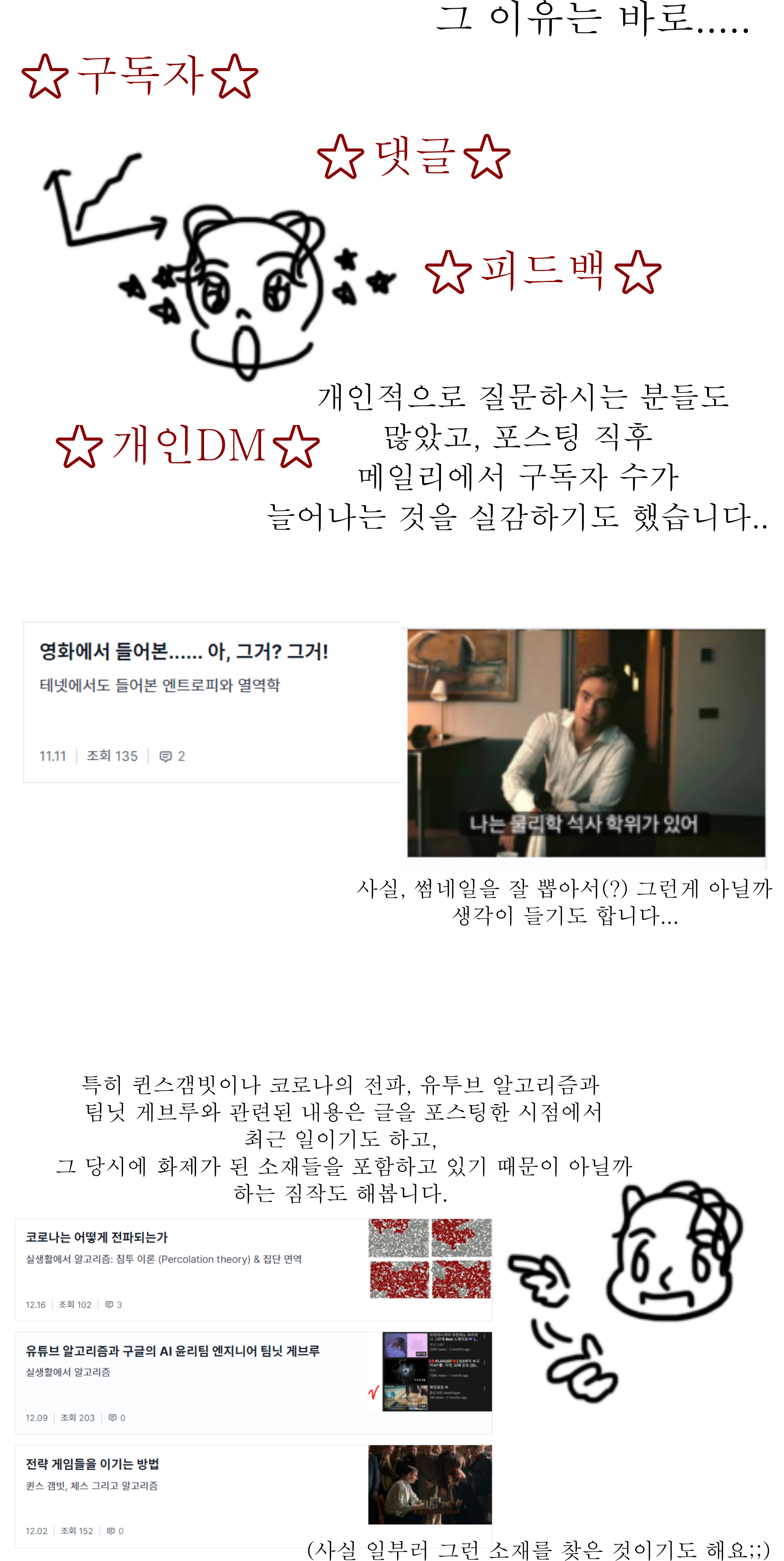 🚽 화장실에서, 지하철에서, 정수기 앞에서 쉽게 읽을 수 있는 과학, 수학은 없을까요? ✉ 모든 구독자: 글이 메일로 전달됩니다. (월 3-4회를 목표로 합니다.) 🎁 유료 멤버십 구독자: 한 주제가 끝나고, 작가의 개인적인 에세이가 전달됩니다. 추후 있을 작가-독자 오프라인 모임에 초대 우선권이 부여됩니다. 👨🏻🎓 본업은 이론 물리학 박사 과정 학생입니다.