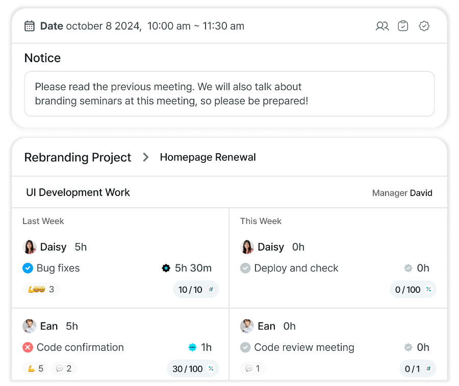 1) 주간회의를 통해 일주일 단위의 목표를 수립하고 이에 대한 회고를 진행할 수 있습니다.