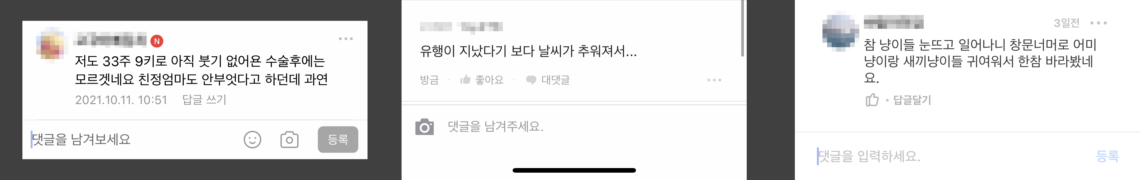 (1) ๋๊ธ์ ํ ์คํธ๋ก๋ง ์ ๋ ฅํ ์ ์์ต๋๋ค. ๋๊ธ ๊ตฌ์ฑ์ ๋ค์ด๋ฒ ์นดํ์ ์ ์ฌํ์ง๋ง ์์ฑ ์๊ฐ ๊ฐ์ ๋ํ ์ผ์ ์กฐ๊ธ ๋ค๋ฅด๊ฒ ๋ฐฐ์น๋์ด ์์ต๋๋ค.