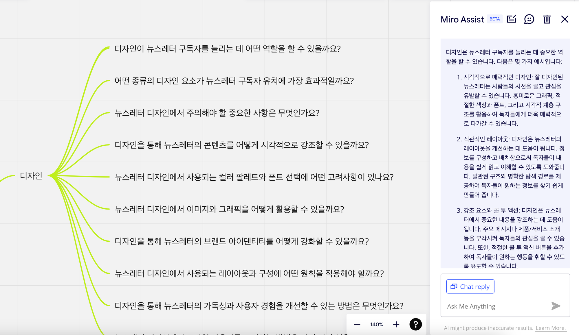 ๋งˆ์ธ๋“œ๋งต ์ƒ์„ฑ ๊ธฐ๋Šฅ์„ ํ†ตํ•ด ๊ฐ€์ง€์— ๋”ฐ๋ผ ๋‹ค์–‘ํ•œ ๋‚ด์šฉ์„ ํ™•์ธํ•˜๋‹ค ์กฐ๊ธˆ ๋” ๊นŠ๊ฒŒ ์ƒ๊ฐํ•ด ๋ณผ ๋‚ด์šฉ์ด ์žˆ๋‹ค๋ฉด, โ€˜๋ฌด์—‡์ด๋“  ๋ฌผ์–ด๋ณด์„ธ์š”โ€™ ๊ธฐ๋Šฅ์„ ํ™œ์šฉํ•ด ๋ณด์„ธ์š”. ์ฑ„ํŒ… ํ˜•์‹์œผ๋กœ ๋‹ต๋ณ€์„ ์ด์–ด์„œ ํ™•์ธํ•  ์ˆ˜ ์žˆ์–ด์š”. ์˜ˆ๋ฅผ ๋“ค์–ด, ์ €๋Š” ๋””์ž์ธ์ด ๋‰ด์Šค๋ ˆํ„ฐ ๊ตฌ๋…์ž๋ฅผ ๋Š˜๋ฆฌ๋Š”๋ฐ ์–ด๋–ค ์—ญํ• ์„ ํ•  ์ˆ˜ ์žˆ์„๊นŒ์š”?๋ฅผ ์งˆ๋ฌธ์œผ๋กœ ์ƒ์„ฑํ•˜๊ธฐ ๊ธฐ๋Šฅ์œผ๋กœ ํ™•์ธํ–ˆ๋Š”๋ฐ์š”. ๋ณด๋‹ค ๊ตฌ์ฒด์ ์ธ ๋‹ต๋ณ€์„ ์–ป๊ณ  ์‹ถ์–ด ์ฑ„ํŒ…์œผ๋กœ ๋‚จ๊ฒผ๋”๋‹ˆ 4๊ฐ€์ง€ ์ƒ์„ธ ๋‹ต๋ณ€์„ ํ™•์ธํ•  ์ˆ˜ ์žˆ์—ˆ์–ด์š”. ์ด๋ ‡๊ฒŒ ์ƒ์„ฑ๋œ ๋‹ต๋ณ€์€ ๋ฏธ๋กœ ๋‚ด โ€˜์Šคํ‹ฐํ‚ค ๋…ธํŠธโ€™๋กœ ์ƒ์„ฑํ•ด ์ ์šฉํ•˜๋Š” ๊ฒƒ๋„ ๊ฐ€๋Šฅํ•ด์š”.