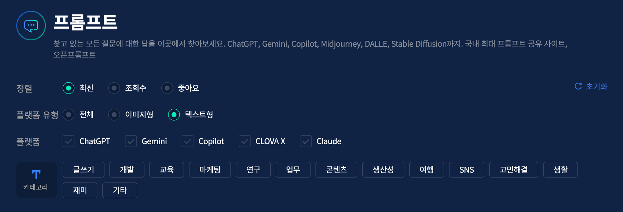 ํ๋กฌํํธ ํ๋ฉด์ ๋ค์ด๊ฐ๋ฉด ๊ฐ์ฅ ๋จผ์ ์ ๋ ฌ, ํ๋ซํผ ์ ํ, ํ๋ซํผ, ์นดํ ๊ณ ๋ฆฌ๋ฅผ ํ์ธํ ์ ์์ด์. ์นดํ ๊ณ ๋ฆฌ๋ ์ ํํ ํ๋ซํผ์ ๋ฐ๋ผ ๋ฌ๋ผ์ง๋๋ฐ, ์ด๋ฏธ์งํ์ ์ ํํ๋ฉด ๋ฏธ๋์ ๋, ๋ฌ๋ฆฌ ๋ฑ์ ํ์ธํ ์ ์๊ณ ํ ์คํธํ์ ์ ํํ๋ฉด ์ฑGPT, ์ ๋ฏธ๋์ด, ์ฝํ์ผ๋ฟ, ํด๋ก๋ฐX, ํด๋ก๋ ๋ฑ์ ํ์ธํ ์ ์์ด์. ์์ ์ด์ผ๊ธฐํ ๊ฒ์ฒ๋ผ, ์ด๋ฏธ์งํ์ ๋ฌผ๋ก ํ ์คํธํ๋ ์ง์ํ๊ธฐ์ ๋ ๋์ ๋ฒ์์ ํ๋กฌํํธ ์ฌ๋ก๋ฅผ ๋ณผ ์ ์๋๋ฐ์. ๊ธ์ฐ๊ธฐ, ๊ต์ก, ๋ง์ผํ , ์ฝํ ์ธ , ์์ฐ์ฑ, ์ฌํ ๋ฑ์ ์ง์ํ๊ณ ์์ด์.