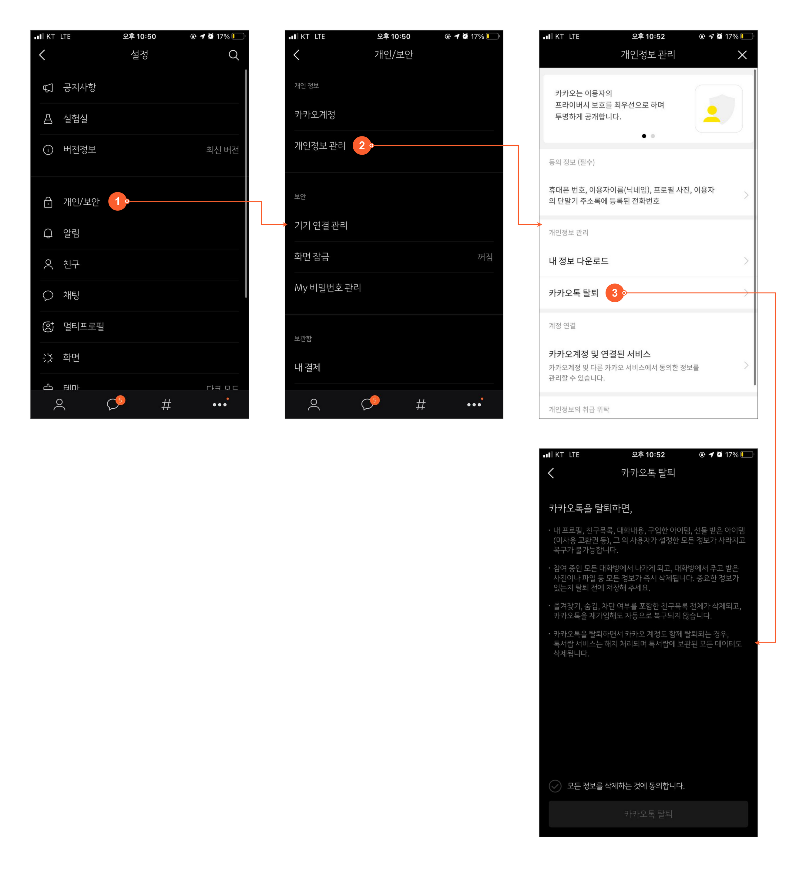 ๊ณ์ ๊ด๋ฆฌ๋ก ์ ๊ทผํ๋ ๋ฐ๋ก [๊ณ์ ์ญ์ ] ํญ์ด ์์ต๋๋ค. ์ด ํญ์ ๋๋ฅด๋ ๊ณ์ ์ ์ญ์ ํ๊ฒ ๋๋ฉด ์ ํ๋๋ ๋ด์ฉ์ด ์ ํ์์ด์. 30์ผ๊ฐ ๊ณ์ ์ด ๋นํ์ฑํ๋๊ณ ๊ทธ ์์ ๋นํ์ฑํ๋ฅผ ํ์ง ์์ผ๋ฉด ๊ณ์ ์ด ์ญ์ ๋๋ค๊ณ ์๋ดํฉ๋๋ค. ์ฉ๊ธฐ ๋ด [๊ณ์]์ ๋๋ฅด๋ ๊ฐ์ ์ ๋ณธ์ธ์ธ์ฆ์ ์งํํ [KakaoTalk๋ก ๊ณ์ ์งํ] ๋ฒํผ์ด ๋์์ด์. ์นด์นด์คํก์ผ๋ก ์ ์ ํ๋ฉด์ด ์ฎ๊ฒจ์ก๋ค๊ฐ ์ธ์ฆ ํ ์ต์ข [๊ณ์ ์ญ์ ] ๋ฒํผ์ด ๋์ต๋๋ค.