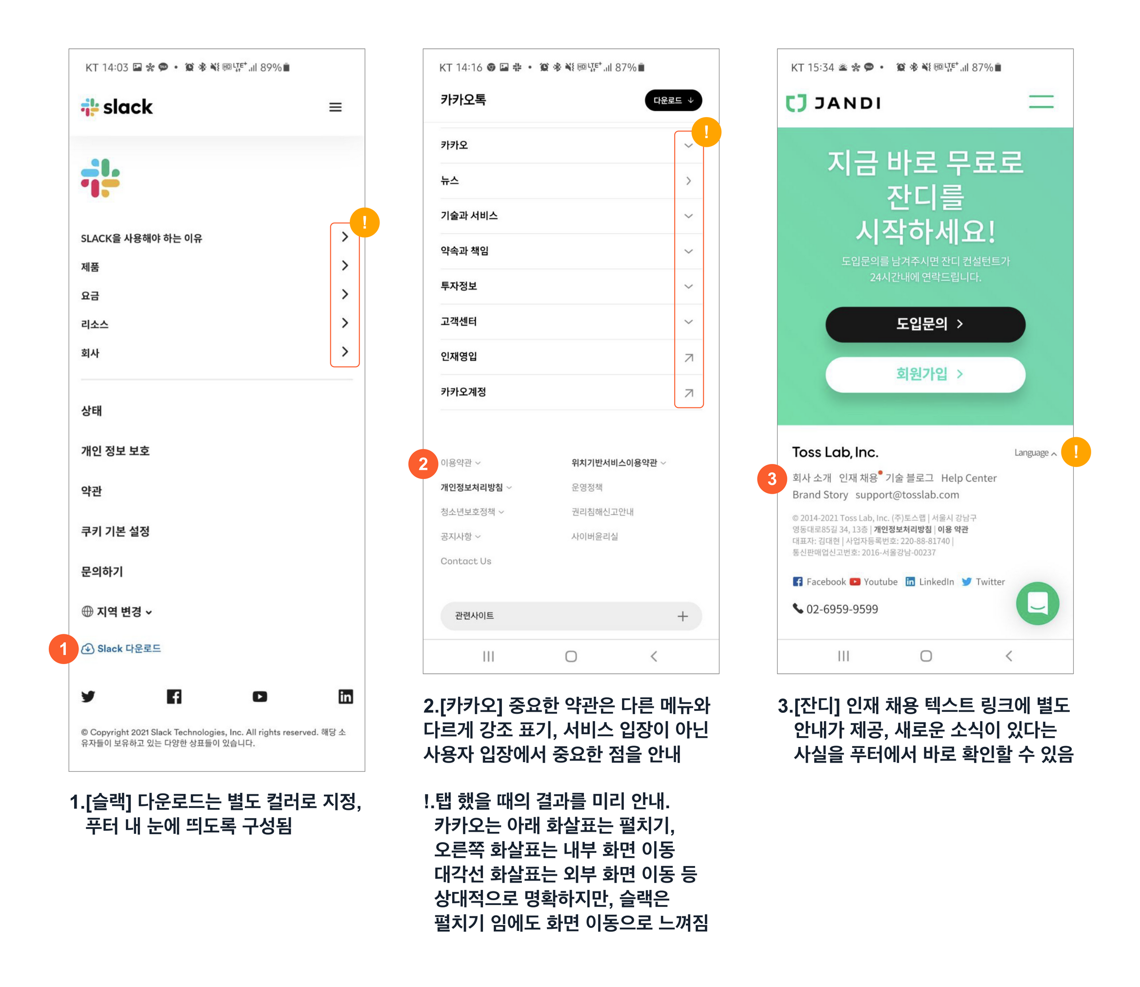 ์์ธํ ๋ณด๋ฉด ํธํฐ ๋ด ์๋น์ค ์๊ฐ ๋ด์ฉ๊ณผ ์ฌ์ฉ์ ๊ด๋ จ ๋ด์ฉ ๊ฐ ํฐํธ ์ฌ์ด์ฆ๊ฐ ๋ค๋ฅด๊ฒ ์ ์ฉ๋ ๊ฒ์ ์ ์ ์๋๋ฐ์. ์๊ฐ ๋ด์ฉ์ ์์ ๋ดค์ ๊ฐ๋ฅ์ฑ์ด ๋๊ณ , ์ฌ์ฉ์์ ๊ด๋ จ๋ ์ ์ฑ ๋ฑ์ ์๋์ ์ผ๋ก ๊ธฐ๋ฅ ์๊ฐ ๋ฑ์ ๊ฐ๋ ค์ก์ ๊ฐ๋ฅ์ฑ์ด ๋๊ธฐ์ ๋ ๊ฐ์กฐํ ๊ฒ์ผ๋ก ๋ณด์ฌ์. (1) ์ฌ๋์ ๋ค์ํ ํ๋ซํผ์์ ์ฌ์ฉ์ด ๊ฐ๋ฅํ๊ธฐ์ ๋ค์ด๋ก๋ ๋งํฌ๋ ๋ณ๋ ์ปฌ๋ฌ๋ก ๋ฐ์, ๋์ ๋๊ฒ ๋ฐฐ์นํ ๋ชจ์ต์ ๋๋ค.