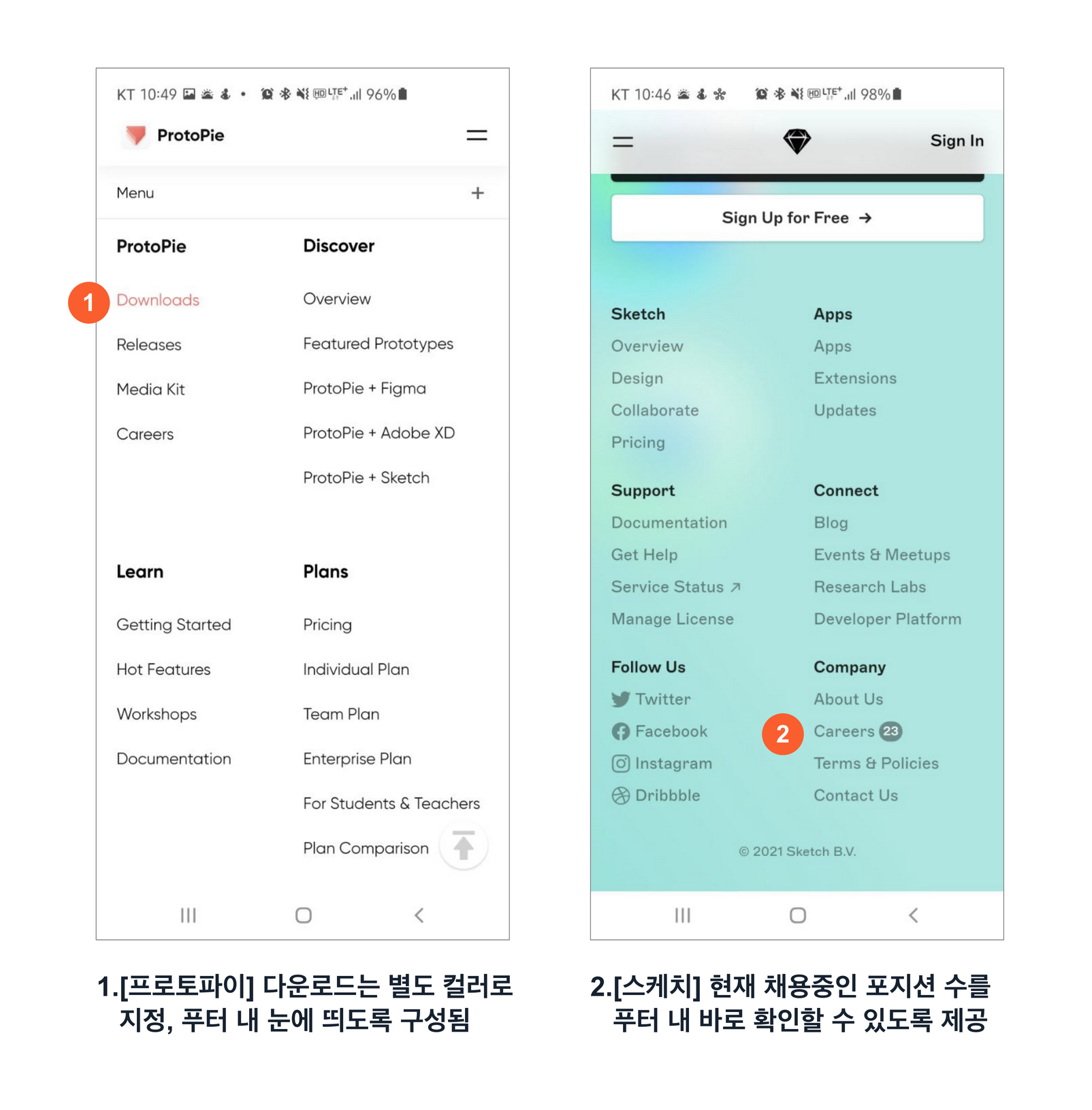 ์ฌ๋์ด ํธํฐ์์ โ๋ค์ด๋ก๋โ ๋งํฌ๋ฅผ ๋ณ๋ ์ปฌ๋ฌ๋ก ์ง์ , ํ์ฉํ๊ณ ์์๋๋ฐ์. (1) ํ๋กํ ํ์ด ์ญ์ ๋ค์ด๋ก๋ ๋งํฌ๋ ๋ธ๋๋ ๋ฉ์ธ ์ปฌ๋ฌ๋ก ์ง์ ํ๊ณ ์์ด์. ๋๋ถ์ ๋ค๋ฅธ ๋ฉ๋ด ๋๋น ๋์ ์ ๋๋ค์. ์๋๋ ์ฑ์ฉ์ค์ธ ํฌ์ง์ ์ด ์์ ๋ ๋ณ๋ ์๋ด๋ฅผ ํ๊ณ ์๋๋ฐ์. (2) ์ค์ผ์น๋ ์ฑ์ฉ์ค์ธ ํฌ์ง์ ์ โ์โ๋ฅผ ๊ตฌ์ฒด์ ์ผ๋ก ์๋ดํ๋ ๋ชจ์ต์ ๋๋ค.