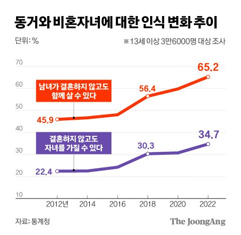 통계청에서 진행한 사회조사에 따르면 “결혼을 하지 않고도 자녀를 가질 수 있다.”는 인식은 22.4%에서 34.7%까지 상승했습니다.