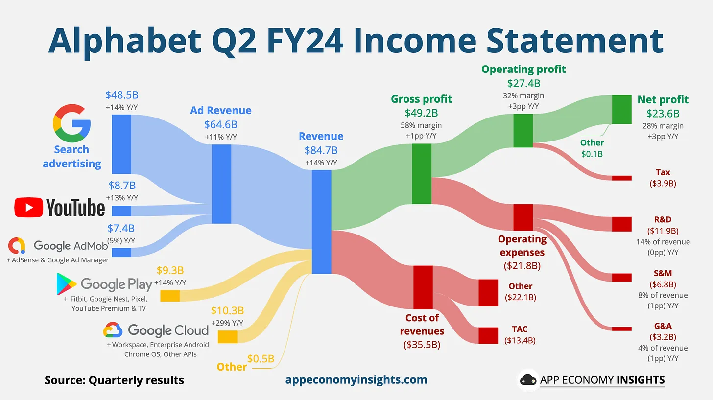 1. 알파벳의 2024년 2분기 실적은 애널리스트들의 예상을 상회 했음에도 불구하고 주가는 하락했습니다. 매출 YoY +14%, 영업이익률 32%, 순이익 YoY +28%