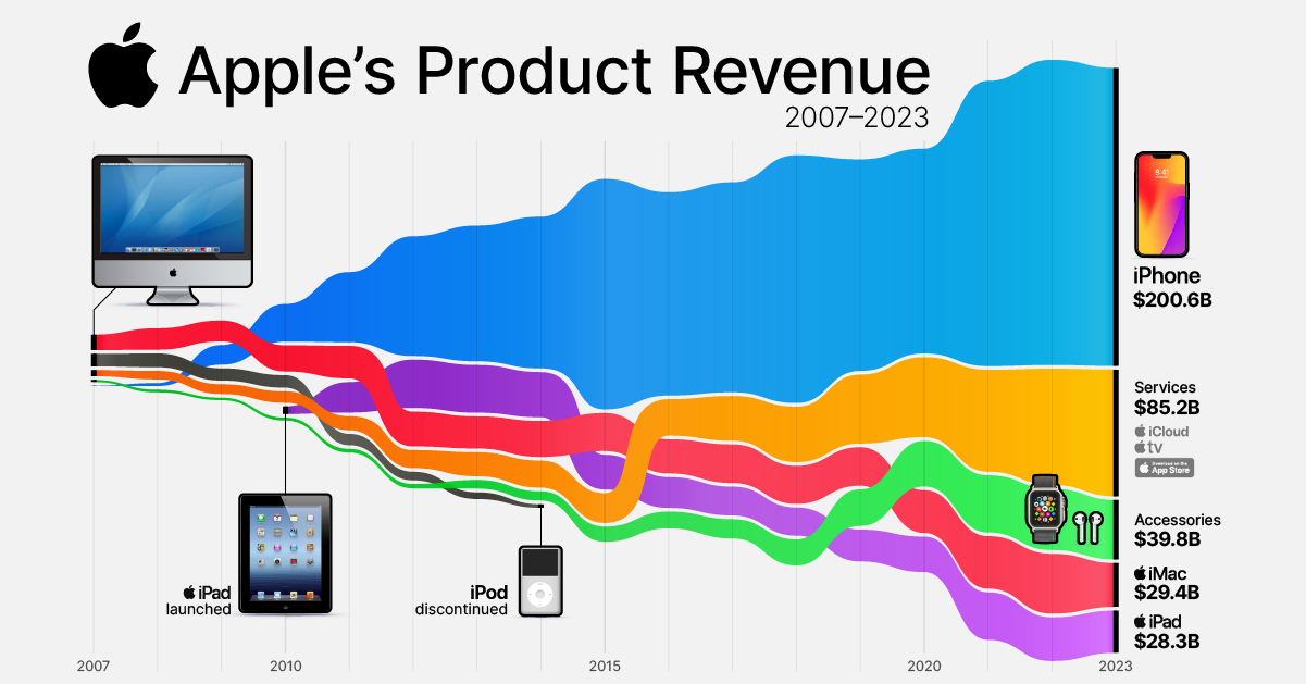 그럼에도 불구하고 애플은 제품 다각화(애플워치 2015년 출시, 에어팟 2016년 출시)와 서비스 비즈니스 매출 덕분에 전체 매출은 계속 증가 시켜왔습니다. 이번 23년에도 유일하게 서비스 부문만이 매출이 증가했습니다.