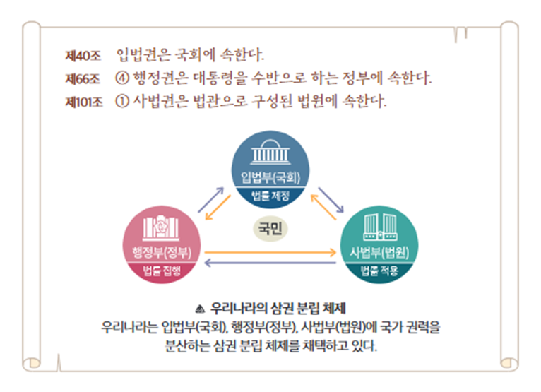 앞서 국가 형성의 원리가 '국민을 중심으로 헌법 질서를 유지한다.'라고 교과서는 설명했는데요. 이를 가능하도록 하기 위해 삼권분립(3가지 권력으로 국가의 권력을 분리한다)의 원칙을 헌법에서 규정하고 있어요.