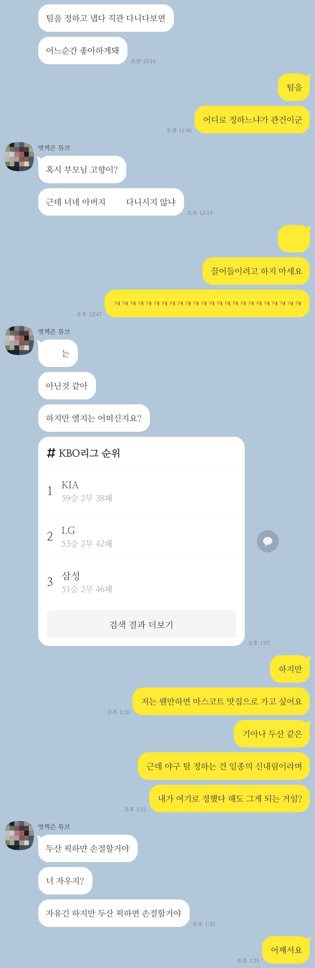 대화를 읽으면 알 수 있겠지만 그녀는 엘지 팬임. 최근에 만났을 때는 일코용 귀걸이로 괜찮을 것 같다며 엘지 트윈스를 상징하는 알파벳 T 형상의 귀걸이를 사 와서 할 말을 잃게 한 전적이 있다. 전 편에서 교묘한 말장난으로 사기행각을 벌인 것도 이 인간임. 아무튼 그녀는 내게 엘지를 영업하려 했으나 롯데 팬의 조언과 망그러진 곰이 구장 위를 아장아장 걸어 다니는 각종 영상으로 인해 우럭은 마스코트 맛집을 원하던 차였고. 그에 따라 기아나 두산을 언급한 저는 친구를 잃을 위기에 직면했습니다. 나중에 이유를 들어보니 원래 엘지랑 두산은 홈구장이 겹쳐서 사이가 안 좋다나 뭐라나. 그건 뭐 사실 알 바 아니라서 저 때까지만 해도 엘지에는 관심 없었어요.