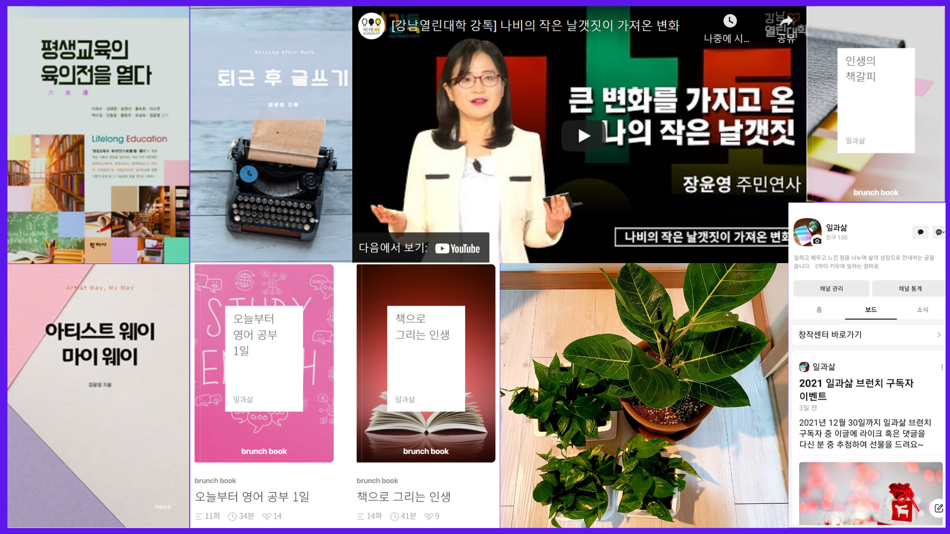 브런치뿐 아니라 블로그, 페이스북, 인스타그램, 유튜브까지 하는데 뉴스레터를 발행할 필요가 있을까요? 지인이 뉴스레터를 발행하는 걸 보니 부럽기도 했고, 메일로 편하게 글을 받길 원하는 분도 있겠더라고요. 그래서 브런치 글 중 매주 토요일 아침 10시에 발행하는 주간 성찰만 뉴스레터로 발행했어요. 올 3월에 일과삶의 주간 성찰 뉴스레터를 시작했는데 감사하게도 111분이 구독하십니다. 작년에 번역서와 제 책을 냈고 또 다른 기회를 모색했는데 제 책을 내지는 못했네요. 감사하게도 공저로 전공 서적 《평생교육의 육의전을 열다》를 출간했고, 《퇴근 후 글쓰기》와 《아티스트 웨이 마이 웨이》를 독립출판으로 냈습니다. 내년에는 좀 더 적극적인 투고를 하렵니다. 우선순위를 조정해야겠어요.